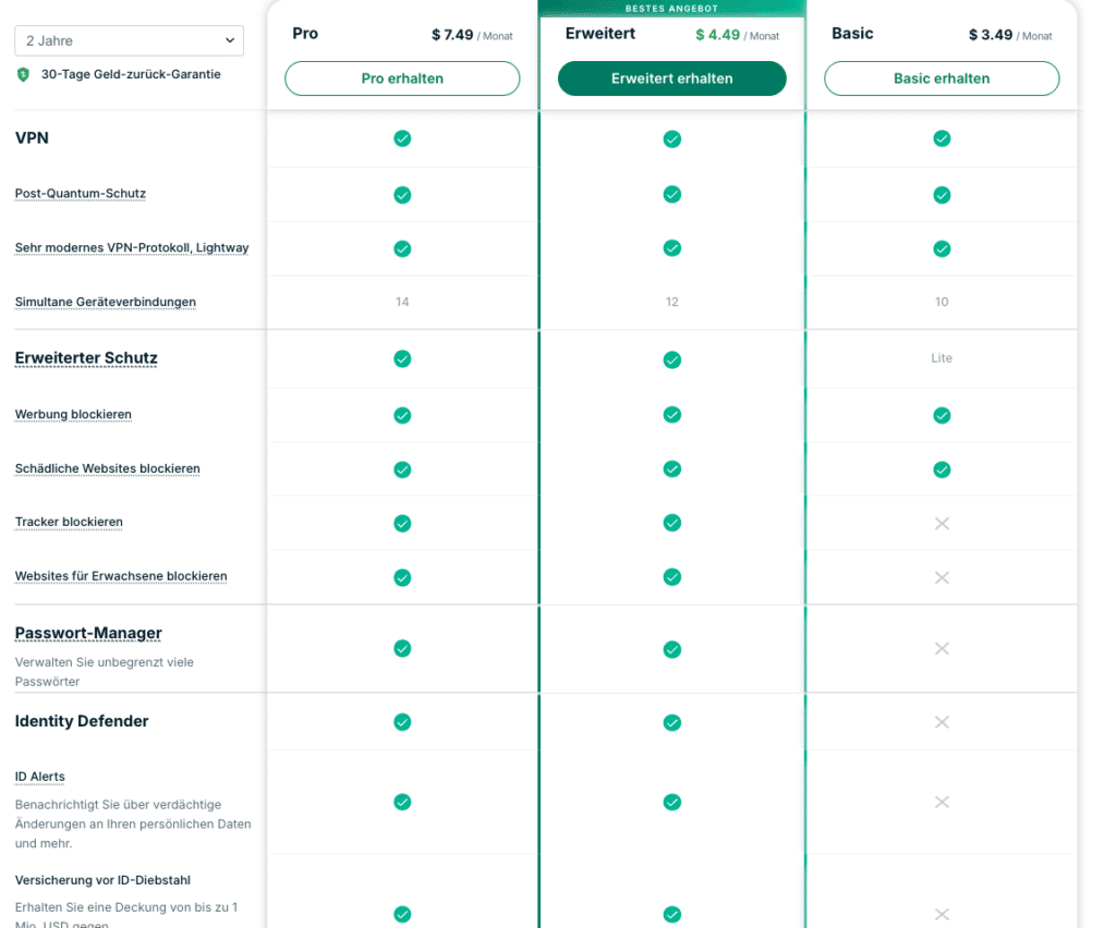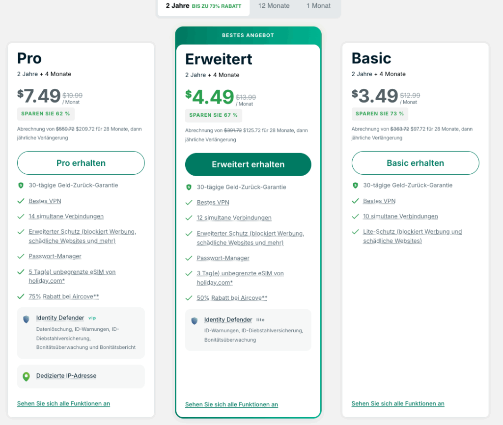 Bestes Gleichgewicht: Fortgeschrittenes 2-Jahres-Paket – zusätzlicher Schutz (Werbung/Tracker-Blocker, Passwortmanager, eSIM-Daten) für einen kleinen Preisaufschlag.