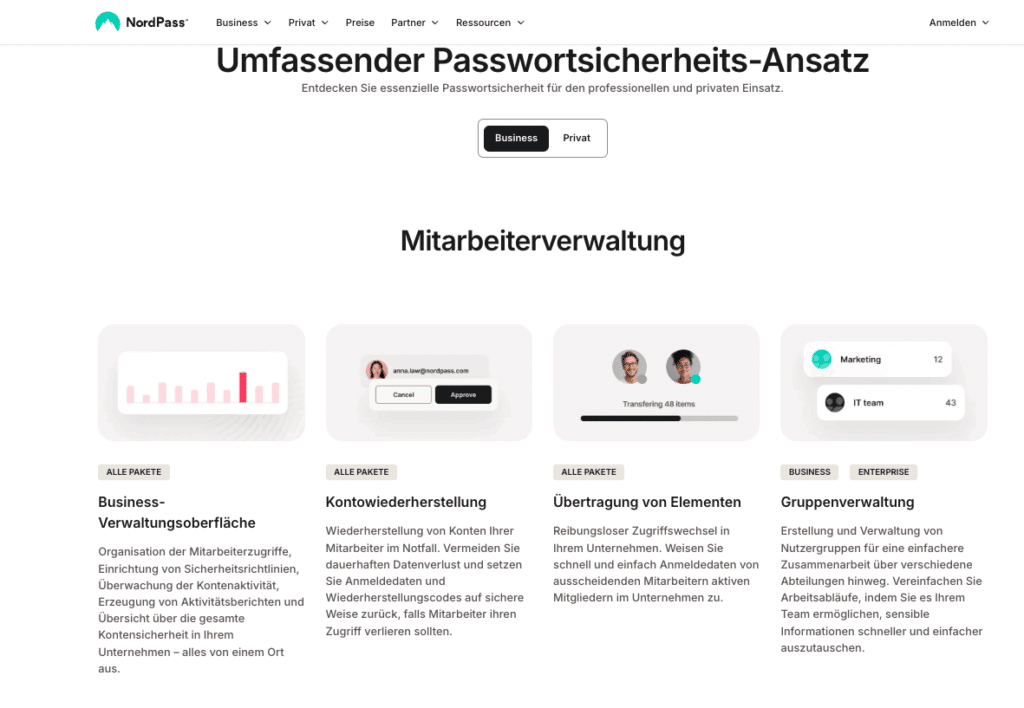 Für Organisationen, egal ob klein, mittelgroß oder groß, bietet NordPass gestaffelte Geschäftslösungen an: