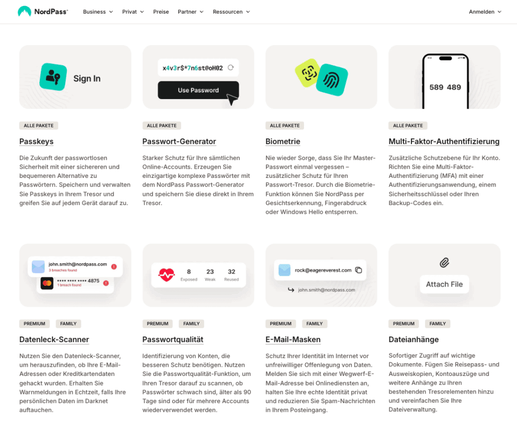 - Passkey-Unterstützung: NordPass unterstützt Passkeys (passwortlose Anmeldungen) in mindestens einigen seiner Tarife.