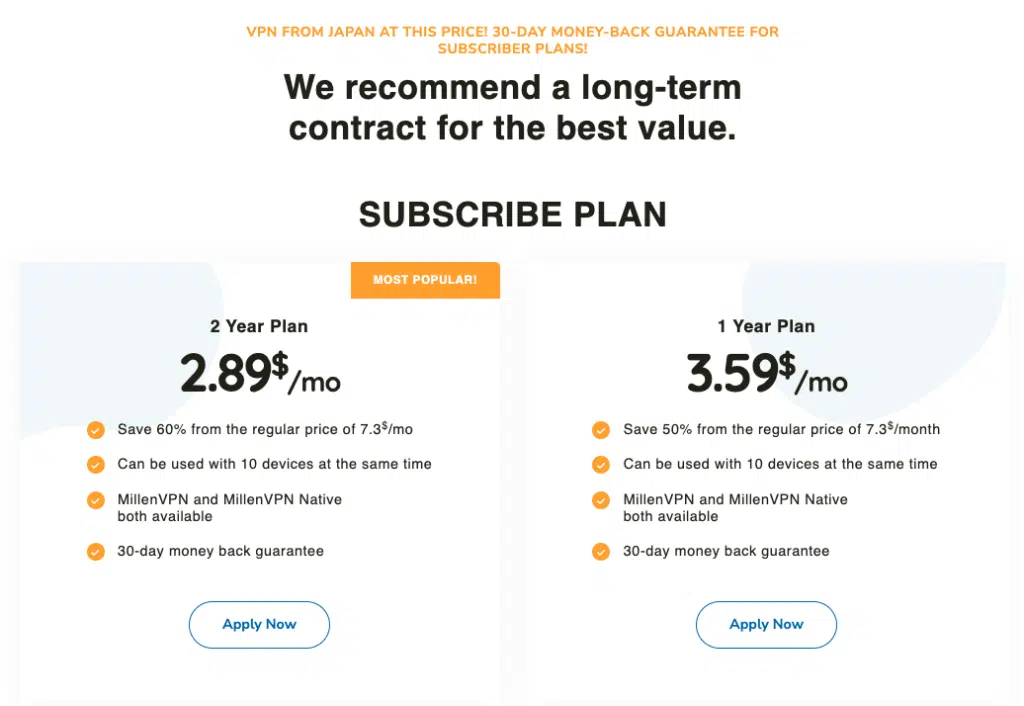 Opciones de suscripción: MillenVPN ofrece tres planes principales de suscripción: mensual, anual y un plan de 2 años. Cuanto más largo es el período de suscripción, más rentable se vuelve el servicio.