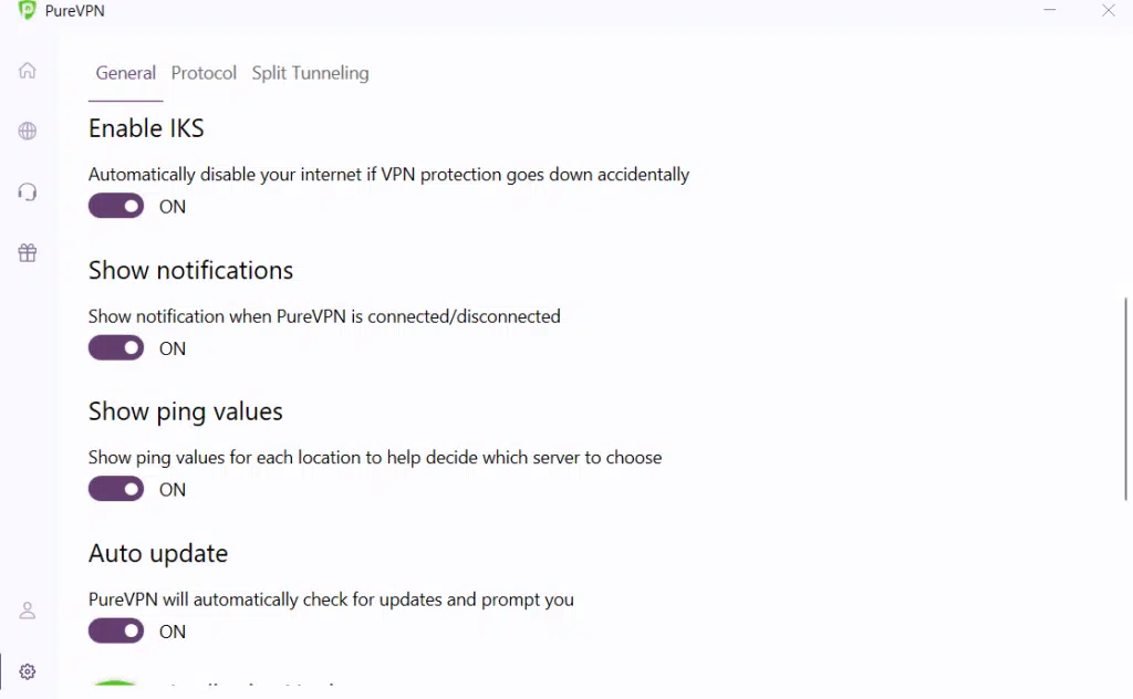 En segundo lugar, PureVPN admite varios protocolos de seguridad, incluyendo PPTP, L2TP, SSTP, IKEv2, WireGuard, OpenVPN e IPSec. WireGuard y OpenVPN ofrecen los mejores niveles de seguridad, con IKEv2 y L2TP también clasificando altamente debido al cifrado de datos doble. El protocolo PPTP es un poco menos seguro con sólo cifrado de 128 bits.