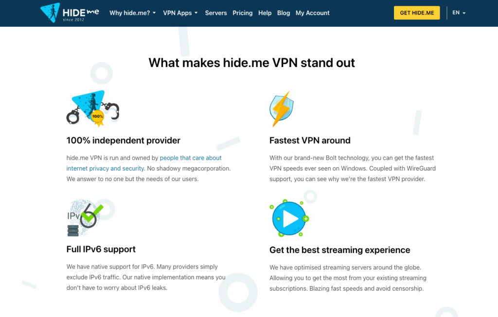 Those servers are optimized for specific streaming sites, making it easier to bypass geo-restrictions on them. All servers support P2P file-sharing and are torrent-friendly. Hide.Me advises that you use Stealth Guard for any torrenting activity to ensure active protection.