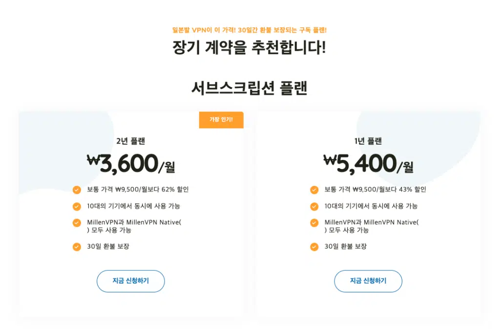 구독 옵션: MillenVPN은 월간, 연간, 그리고 2년짜리 플랜 세 가지 주요 구독 옵션을 제공합니다. 구독 기간이 길수록 서비스의 가성비가 더 좋아집니다.