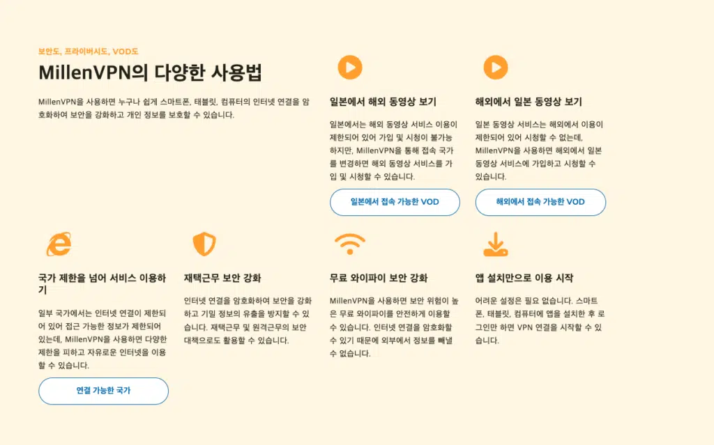 MillenVPN은 인터넷 연결을 보안하는 것뿐만 아니라 여러 실용적인 용도가 있습니다:
