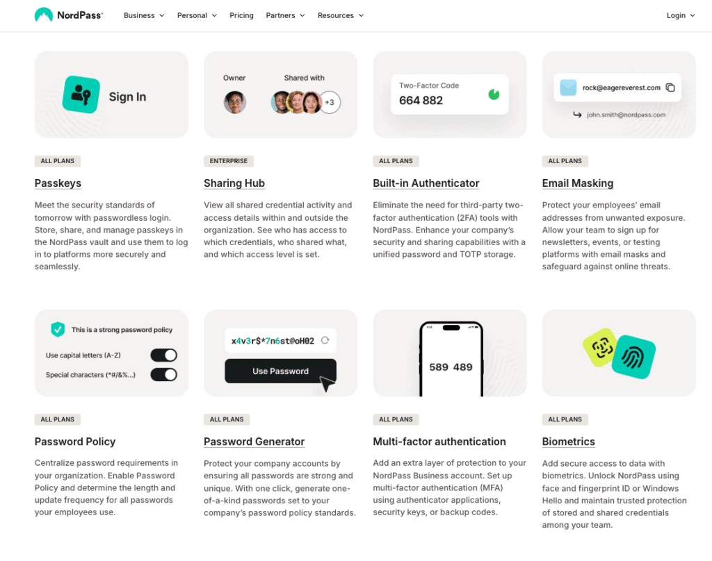 조직의 규모가 작든, 중간이든, 크든, NordPass는 계층화된 비즈니스 제안을 가지고 있습니다: