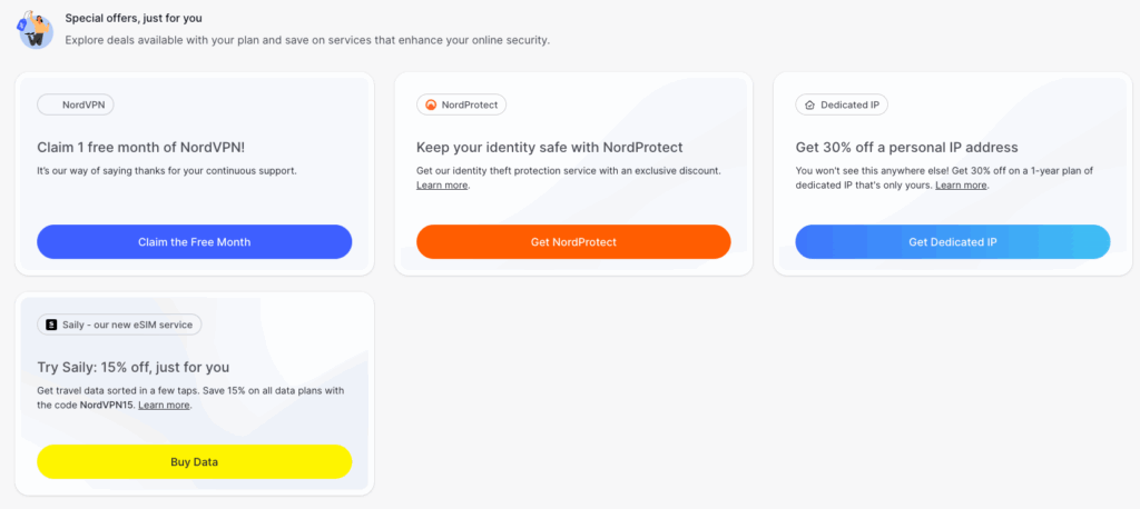 One of the perks of choosing NordVPN is that the savings don’t stop once you’ve signed up. After activating your subscription, NordVPN unlocks a set of exclusive member-only offers designed to reward loyalty and enhance your privacy setup. These deals are not visible on NordVPN’s public website—you only see them inside your personal dashboard after logging in.